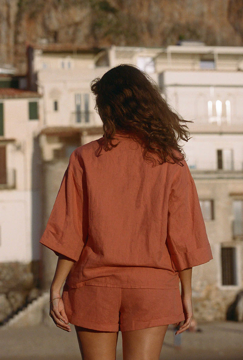 Sa couleur terracotta réchauffera votre teint à l’arrivée des beaux jours. Pour aller avec la chemise Edith terracotta, nous avons créé un short en lin dans le même coloris !
