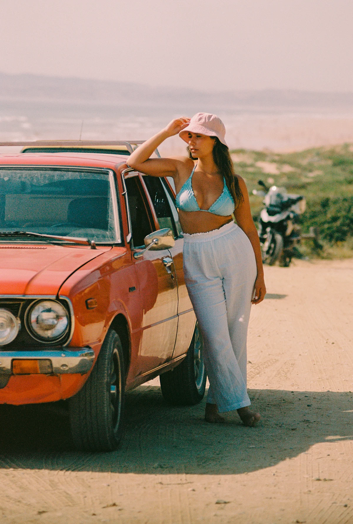 Le top Nellie bleu ciel est un haut de maillot de bain triangle en fibres recyclées fabriqué au Portugal. Il se noue dans le cou et dans le dos, et vous pouvez faire coulisser ses bonnets pour l'ajuster parfaitement à votre poitrine. Un brin rétro avec ses élastiques "petits ponts", il est aussi très féminin grâce à sa forme triangle et à sa jolie couleur pastel.